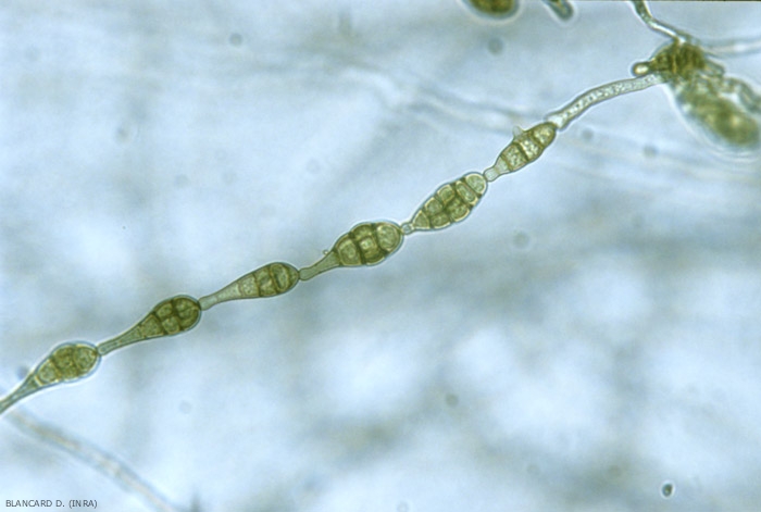 Des conidies sont produites en chaînes à leur extrémité terminale. Ces conidies pluricellulaires (= dictyospores) sont d'abord ovoïdes puis finissent par être prolongées par d'un bec, prenant alors la forme d'une massue et progressivement une teinte brune (figure 1). Les cloisonnements transversaux et longitudinaux de ces conidies constituent un trait tout à fait caractéristique du genre Alternaria. Assemblées en chaînes plus ou moins longues (figure 2), elles ont une forme irrégulière et des dimensions variables (20-80 x 9-18 µm). Leur bec apical, bien différencié, ne dépasse pas le 1/3 de la longueur totale de la conidie.