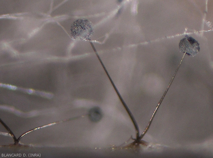 Les sporangiophores, de couleur brune, sont isolés ou assemblés en touffes peu fournies. D'une longueur atteignant les 3,5 mm et d'une largeur de 20-34 µm, ces structures, à l'extrémité desquelles se trouvent les sporanges, sont facilement visibles à la loupe binoculaire. Les sporanges apparaissent telles des vésicules globulaires noires de diamètre situé entre 40 et 350 µm, avec une base aplatie.