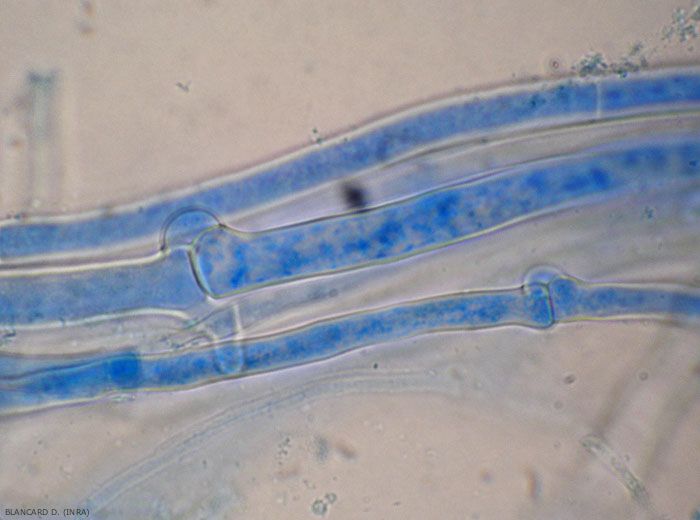 Développement, sporulation : Forme rapidement du mycélium et des sclérotes sur les tissus lésés.