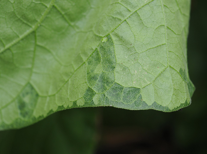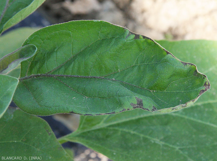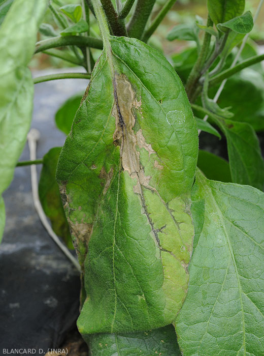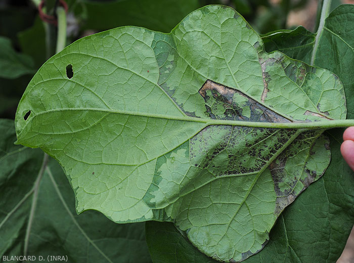 • Taches plus ou moins étendues sur feuilles, d'abord vitreuses et humides, noircissant rapidement, et pouvant altérer de larges secteurs du limbe qui finissent par se nécroser et se dessécher.