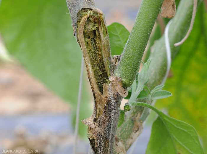 • Brunissement, noircissement de secteurs externes plus ou moins étendus de tiges, altération de la moelle.