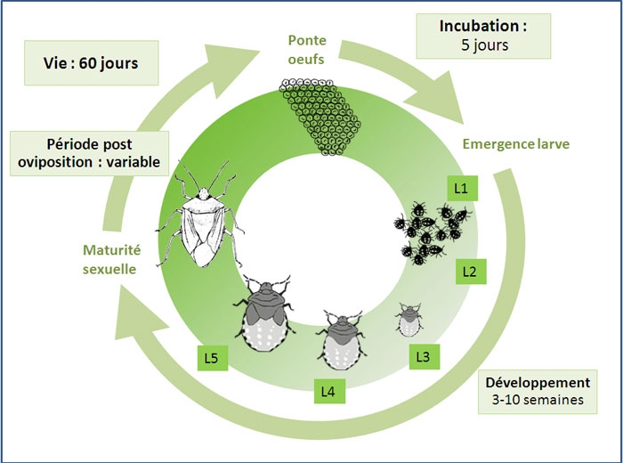 • Cycle de développement (figure 9) : N. viridula passe par plusieurs stades : oeuf, 5 stades larvaires, adulte. La durée de son cycle (figure 4) varie en fonction de la température,d'approximativement 3 semaines à 30°C à 2 mois à 20°C`.