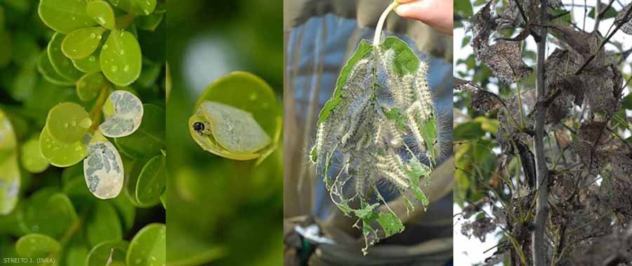 - Types de dégâts et symptômes : les racines, les feuilles, les tiges, les rameaux, les bourgeons, les fleurs, les fruits et les graines, sont dévorés, broutés, rongés ou décapés (parfois de façon caractéristique, tels les othiorhynques sur les feuilles. Dans certaines situations, la défoliation peut être totale et les jeunes plants sont irrémédiablement détruits. De la même manière, les bourgeons, les boutons floraux ou les fruits en formation sont parfois, entièrement consommés.