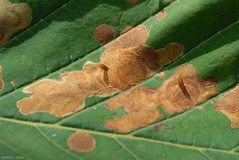 - Types de dégâts et symptômes : présence de galeries, ou mines, dans les feuilles (très fréquent), les tiges ou les fruits.