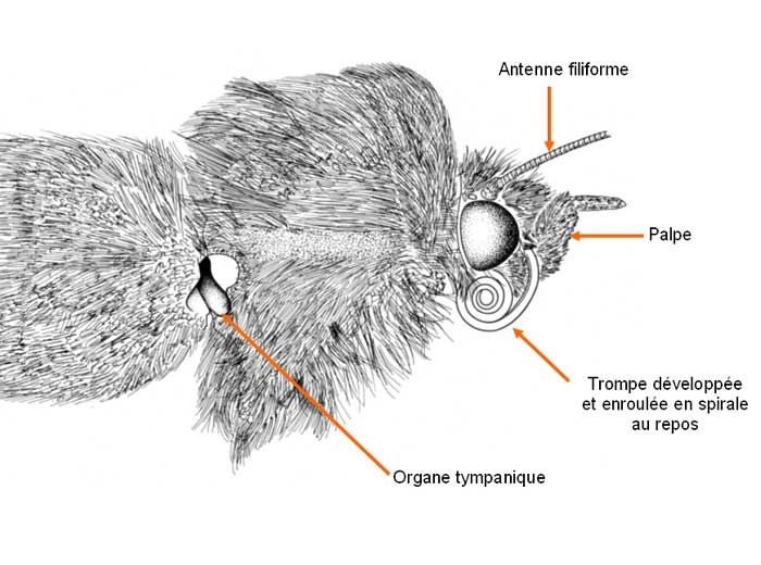 Il porte trois paires de pattes fonctionnelles et les 2 paires d'ailes. Le thorax est pourvu de tympans latéraux métathoraciques qui émettent et perçoivent des ultrasons (figure 1).