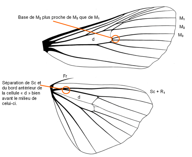 - En revanche, l'uniformité de la nervation alaire des noctuelles permet de les distinguer aisément de tous les autres groupes de papillons (figure 2) ; au niveau de l'aile antérieure, la base de M2 est plus proche de M3 que de M1 ; l'aile postérieure est caractérisée par la sous-costale qui s'écarte du bord antérieure de la cellule bien avant son milieu et n'est jamais renflée à sa base ;