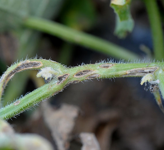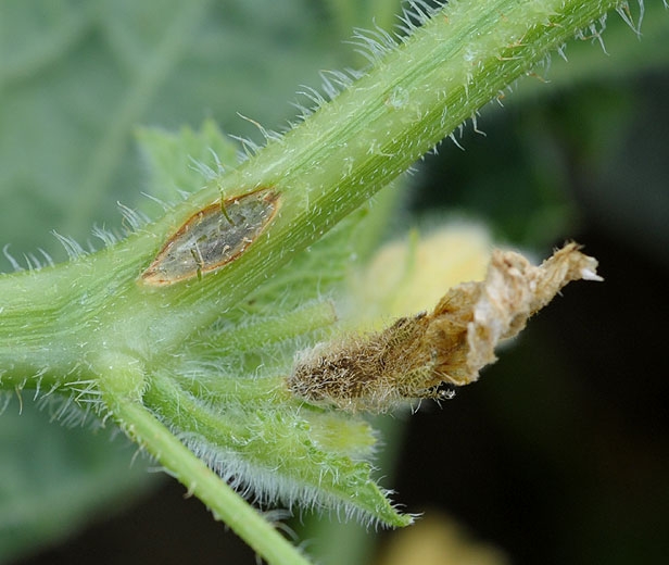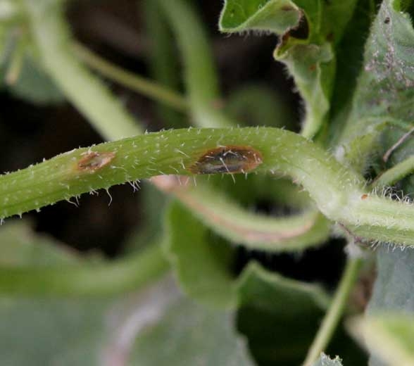 Sur les tiges et les pétioles, des lésions allongées se développent. Elles sont aussi humides dans un premier temps et brunissent progressivement. Leur taille fluctue en fonction des espèces et des conditions climatiques. Notons qu'une substance visqueuse perle parfois des tissus infectés. Sur les tiges de melon (figures 8 et 10), on observe des petits chancres déprimés beiges, en forme de « lèvre ». Avec le temps, ces chancres deviennent elliptiques, marron clair, et un duvet vert sombre les recouvre dans leur partie centrale.