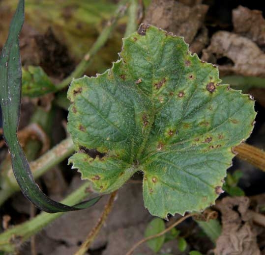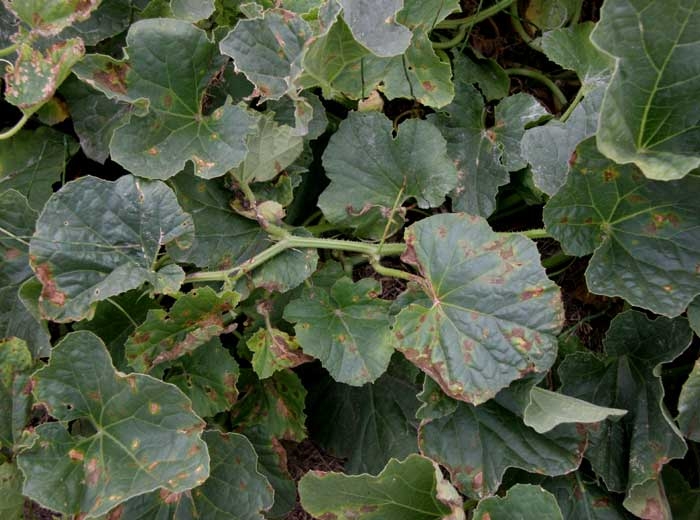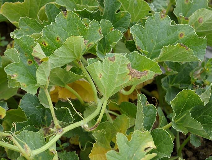 Des petites lésions humides apparaissent sur les feuilles souvent les plus jeunes. Ces lésions s'étendent progressivement pour former des taches plus ou moins circulaires, brunissant et se nécrosant en vieillissant. Elles peuvent prendre parfois une teinte grisâtre et être auréolées d'un halo jaune plus ou moins large. Les tissus affectés peuvent se détacher et tomber, conférant à la partie interne des taches un aspect plus ou moins étoilé, et au feuilles une apparence criblée. Notons que les lésions humides s'initient parfois à partir de nervures qui brunissent localement. Sur feuilles de melon (figures 2 à 7), des taches brunes, petites et nécrotiques apparaissent. Elles peuvent être également grisâtres, brunes en périphérie, parfois anguleuses, entourées d'un halo jaune. Des nécroses nervaires brunes se forment également.