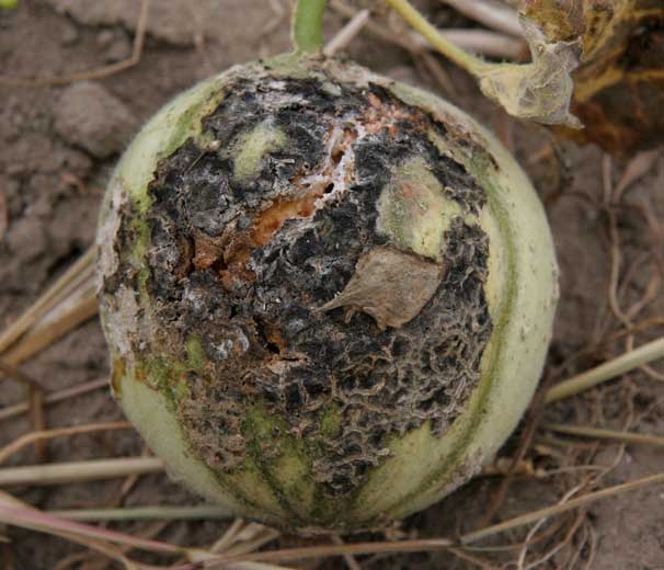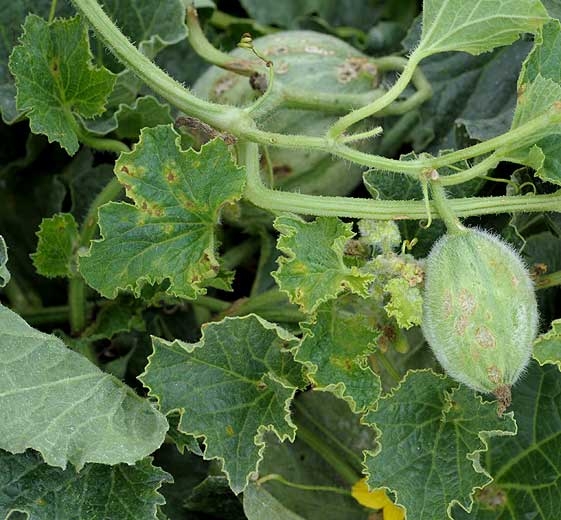 Sur melon (figures 13 à 21), les taches, petites et huileuses dans un premier temps sur jeunes melons, s'étendent, s'allongent, et subérisent localement. Des fructifications du C. cucumerinum se forment au centre des taches et leur confèrent une coloration vert sombre à noire.