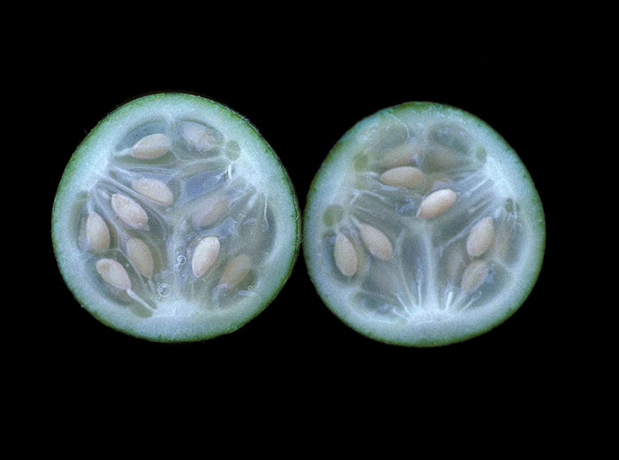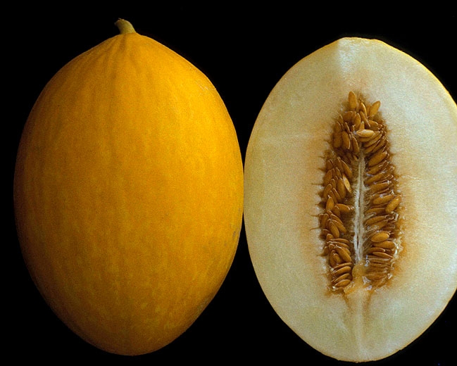 • Fruit rond à elliptique, écorce blanche, jaune, vert moyen ou vert sombre, uniforme ou bien avec des taches, souvent plissée, côtelé ou non côtelé.