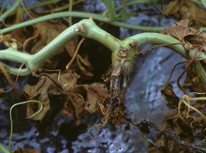 Phytophthora capsici est un oomycète susceptible de s'attaquer à tous les organes des cucurbitacées.