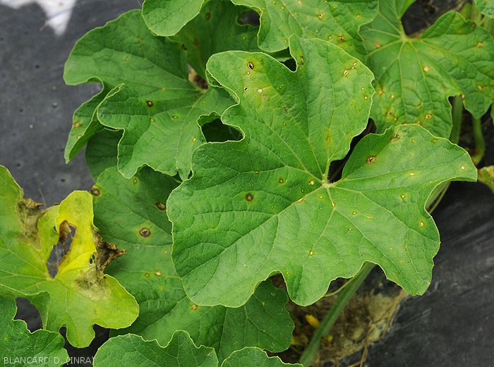 Les feuilles des Cucurbitacées présentent des taches plutôt circulaires brun sombre (figures 1 à 6), révélant parfois des motifs concentriques (figure 3) et coalesçant.