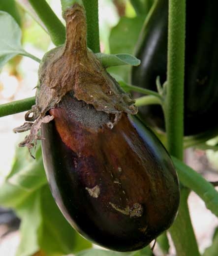 <i><b>Botrytis cinerea</b></i> a  colonisé les sépales de cette fleur d'aubergine sénescente, il ne va pas tardé à envahir le pédoncule et peut être gagner la tige. (moisissure grise, grey mold)