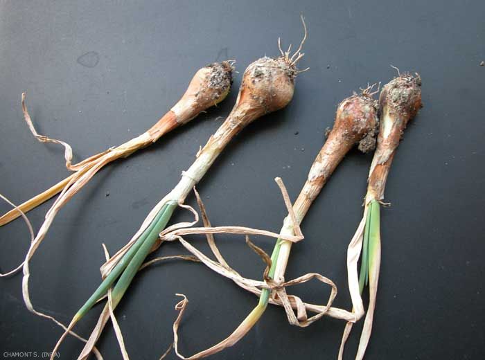 S. minor et S. sclerotiorum sont décrits dans e-phytia sur cultures légumières (salade, tomate). Stromatinia cepivora (anc. Sclerotium cepivorum) provoque la pourriture des racines et de la base des bulbes d'oignons et développe un mycélium blanc à la surface du bulbe (figure). Ces champignons produisent généralement des sclérotes.