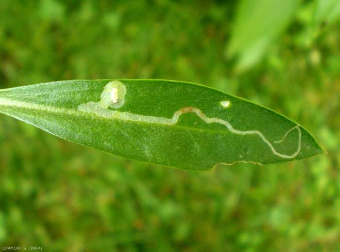 - mine, mineuse (figure 3) : excavation creusée pour se nourrir par une larve d'insecte phytophages, dite mineuse entre les 2 épidermes du limbe d'une feuille. La géométrie de la mine (linéaire, ramifiée, en spirale, etc.) et la disposition du frass (excréments + vermoulure) permettent en général une détermination précise du ravageur. Les principales larves mineuses importantes sur le plan européen appartiennent aux espèces suivantes :
