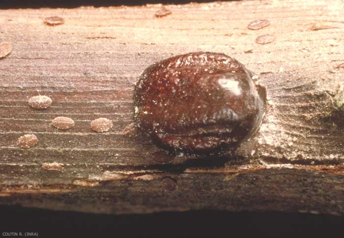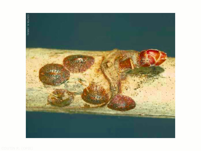 Deux espèces de Parthenolecanium occasionnent des dégâts considérables aux vignobles. Les formes larvaires sont très difficiles à distinguer. La distinction entre les 2 espèces s'effectue à partir des formes adultes. P. corni est une cochenille globuleuse, d'environ 4 à 6 mm de long, 4 mm de large, de couleur brun acajou, luisante, sans carène médiane marquée (figure 1) ; des rugosités marginales prononcées. P. persicae est plus allongée, jusqu'à 1 cm de long, de couleur brun rouge, mate, avec un carène médiane bien marqué, sans rugosités marginales (figure 2).