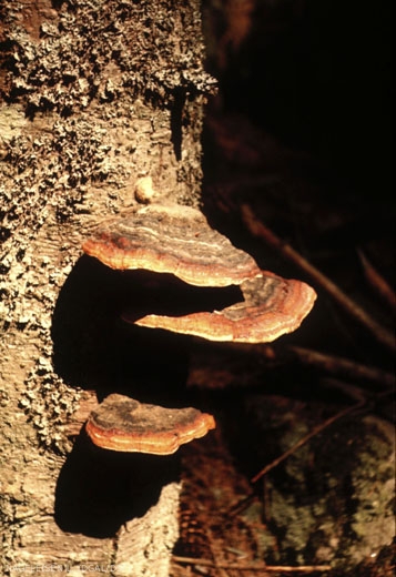 - Fructifications en général sous forme de consoles bien visibles sur le tronc et les branches, émettant une profusion de spores dans l’atmosphère. Celles-ci vont contaminer un arbre au niveau de blessures ou de fissurations de l’écorce.