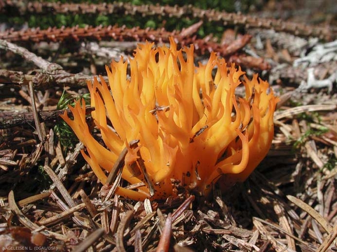 Position systématique : Basidiomycètes surtout Polyporales : Pézize renflée (Rhizina undulata) ; Phéole de Schweinitz (Phaeolus schweinitzii) ; Sparassis crépu (Sparassis crispa) ; Tramète des pins (Phellinus pini) ; Polypore marginé (Fomitopsis pinicola) ; Stérée sanguinolente (Stereum sanguinolentum) ; Phellin de Hartig (Phellinus hartigii) ; Calocère visqueuse (Calocera viscosa).