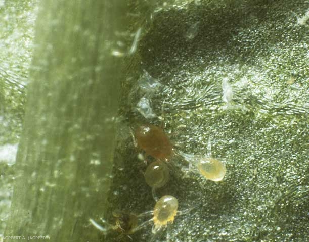 L'adulte se développe après le 2d stade nymphal : il est rouge clair avec de longues pattes et est très actif à des températures élevées. Les femelles mesurent environ 0.6mm de long. On les différentie difficilement des mâles, légèrement plus petits, plus plats et plus allongés.