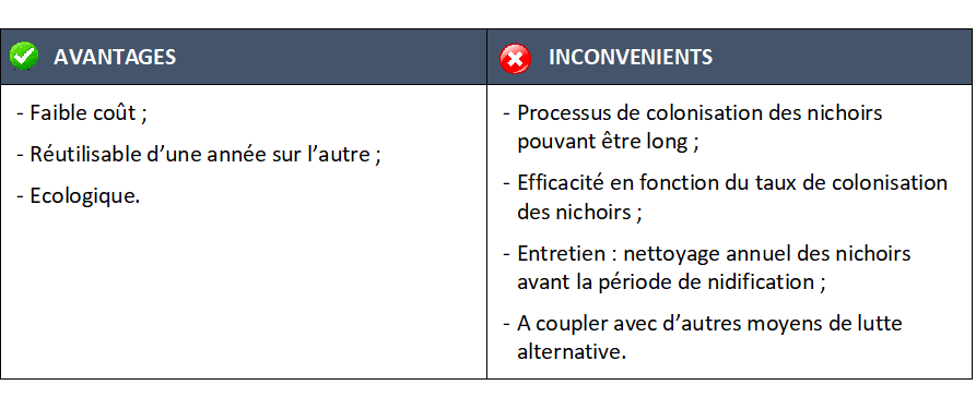 La lutte biologique par l’implantation de nichoirs spécifiques aux mésanges et aux chauves-souris au sein de sites infestés permet de réguler les populations de processionnaires du pin (Pimentel & Nilsson 2007). En effet, les mésanges sont des prédateurs naturels de la processionnaire du pin, et s’attaquent généralement aux chenilles de stades L4 et L5 ; et les chauves-souris s’alimentent d’insectes volants dont les papillons.