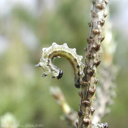 - Larves gris vert (25 mm) à tête et pattes thoraciques noires, portant une bande claire longitudinale dorsale. Elles se dressent en S quand elles sont inquiétées.