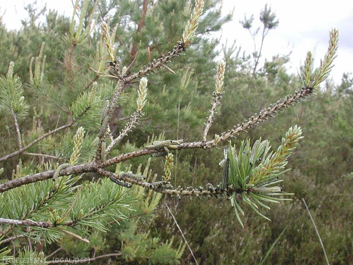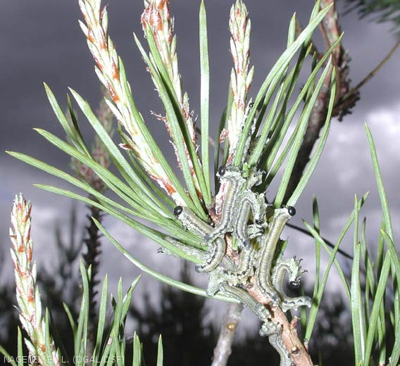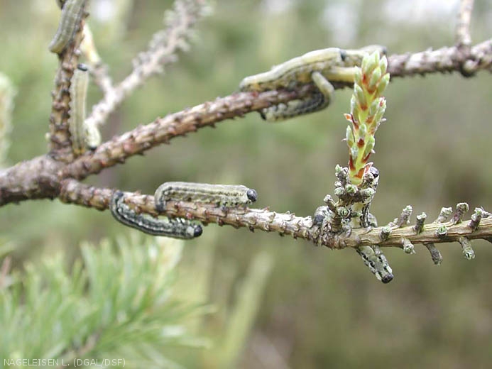 - Les défoliations par les jeunes stades larvaires s'opèrent par l'extrémité des aiguilles de plus de un an en laissant en place le faisceau libéro-ligneux
