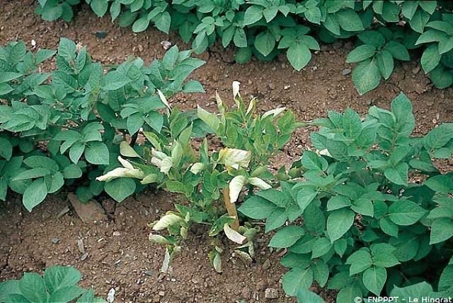 Dans le cas d’une infection secondaire, les symptômes sont en général plus prononcés : la taille des plantes est réduite, les folioles de la base sont fortement enroulés et durcis (photos 3 et 4), avec parfois une bordure violette due à la formation d’anthocyanes (photos 4 et 5) ; le port de la plante est plus dressé (photo 2) et les entre-nœuds sont plus courts. L’enroulement des folioles est moins prononcé sur les jeunes feuilles que sur les feuilles du bas de la plante qui sont fortement enroulées et durcies (les feuilles sont cassantes et produisent un bruit de craquement en les écrasant).