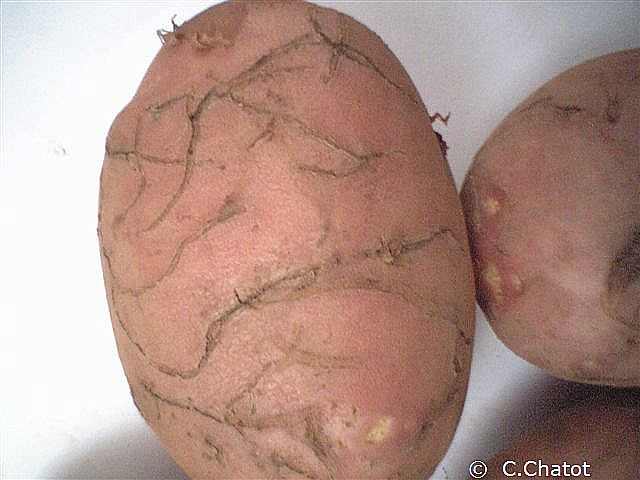Les larves (figure 4) se nourrissent d'habitude des racines et, quand ils sont extrêmement abondantes et selon l'espèce, elles peuvent se nourrir de tubercules, laissant des signes d’alimentation en surface, c'est-à-dire des galeries superficielles, dont les parois subérisent (figures 6 et 7). Avant l'étape pupal, les larves quittent les tubercules pour reprendre leur développement dans le sol.