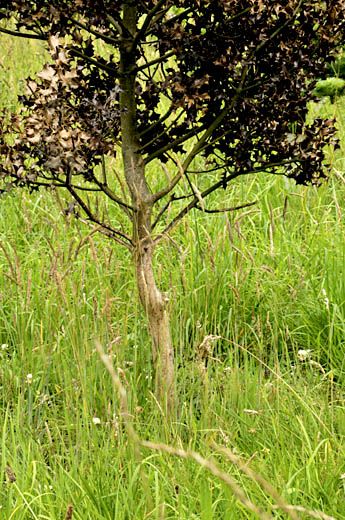 Le lapin écorce les jeunes arbres du collet jusqu’à une hauteur de 40 cm . On remarque la trace des incisives (largeur < 1,5 mm) par de fines stries sur le bois.