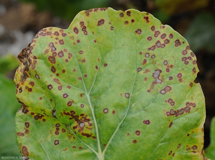 - Description : lésions plus ou moins étendues et délimitées, ayant une forme plus ou moins arrondie, en aucun cas circonscrites par les nervures.