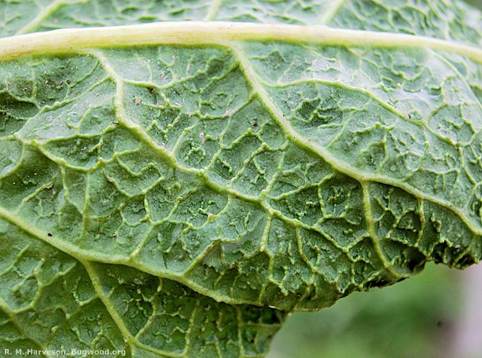 Les pétioles et les nervures prennent un aspect vitreux et la feuille devient crépue.