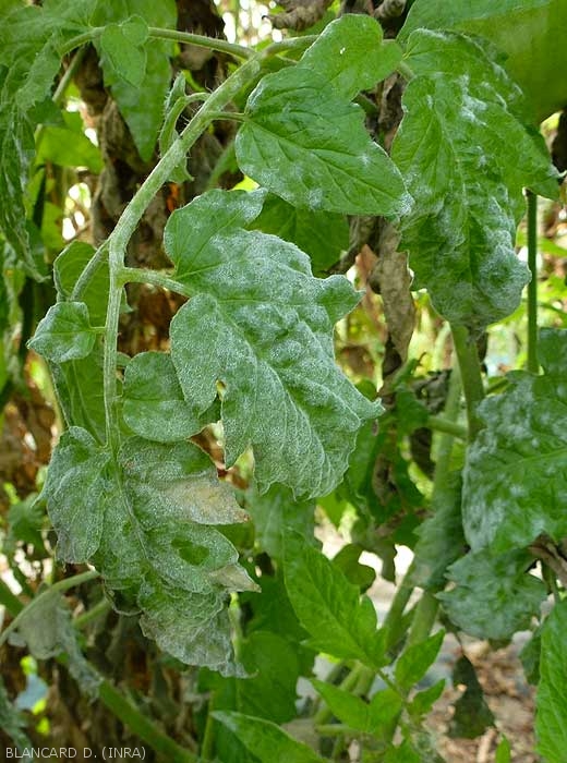 - Taches poudreuses et blanches plutôt localisées à la face supérieure des folioles de tomate (figures 1 à 4).