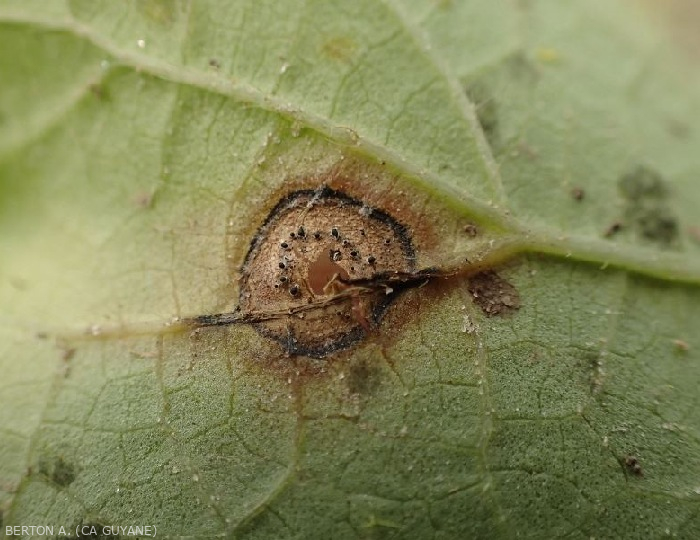 : présence de coussinets sporifères grisâtres à noirs : des sporodochies. Ces structures sont constituées de nombreuses phialides qui forment à leur extrémité des conidies cylindriques, hyalines à légèrement olivâtres.