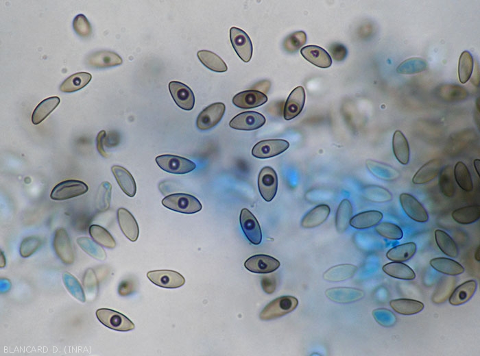 Sur tous les organes colonisés, le champignon produit de nombreuses pycnides sphériques (figure 2) plus ou moins aplanies, brunissant progressivement. Par exemple sur chaque baie de raisin on peut en compter jusqu'à au moins 200. ces structures fongiques produisent plusieurs centaines de spores (figure 3) qui sont extrudées des pycnides par l'ostiole, sous la forme de matrices mucilagineuses. Les conidies seront à l'origine des contaminations secondaires qui seront assurées surtout par les pluies, les éclaboussures d'eau, les ouvriers travaillant lorsque la végétation est humide, etc.