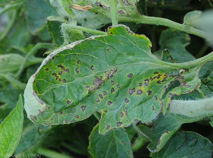 Ces taches peuvent s'étendre et confluer, altérant de larges secteurs du limbe qui finissent par se nécroser et se dessécher. Les feuilles fortement affectées jaunissent, se dessèchent.
