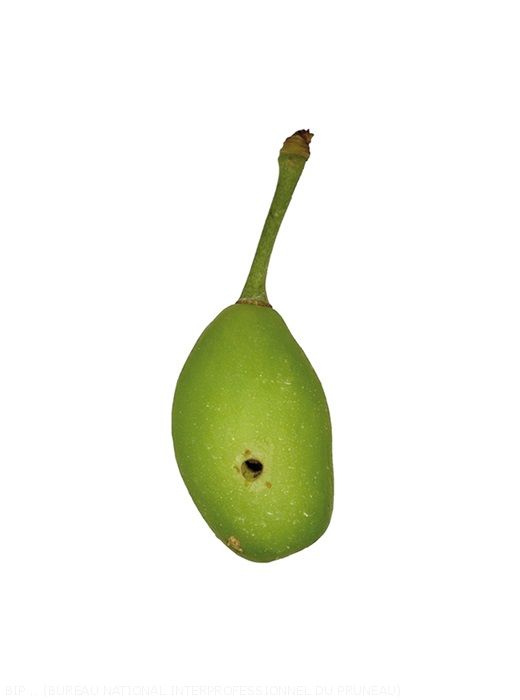 L'intérieur de ces fruits présente une galerie : l'amande du jeune noyau a été dévorée. Si la larve est encore présente, elle dégage une odeur caractéristique de punaise lorsqu'on l'écrase entre les doigts. C’est un signe distinctif en cas de doute.