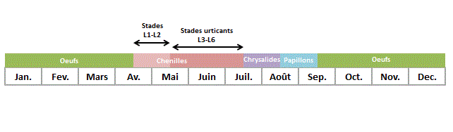C’est également à partir de ce stade, que les chenilles présentent des soies urticantes. Ces soies, en forme de harpon, sont microscopiques et contiennent des protéines urticantes analogues à celles de la processionnaire du pin. Les chenilles les libérant dans l’atmosphère en cas de stress. A la fin du 6ème stade que les chenilles commencent à se nymphoser, et tissent un cocoon de soie, la chrysalide, de laquelle, une quarantaine de jour plus tard les papillons émergent.