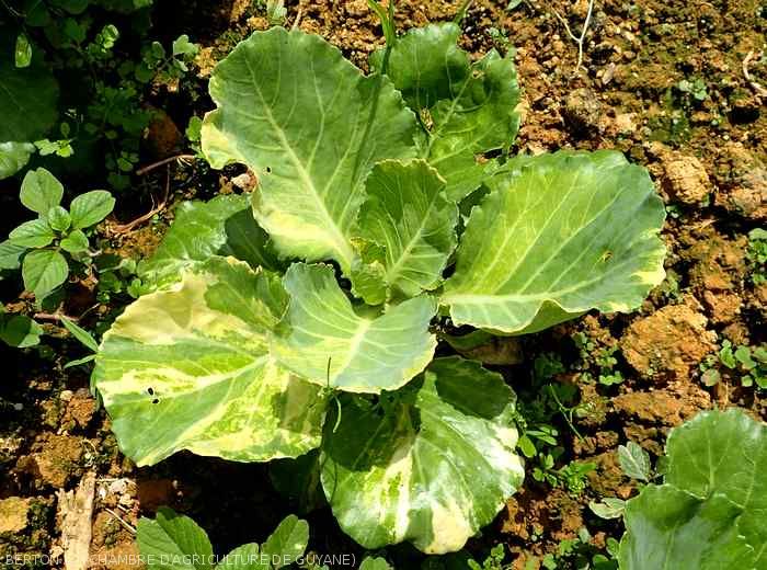 - Cause : mauvais fonctionnement local des tissus du limbe, la synthèse de chlorophylle est plus ou moins inhibée. Cette anomalie génétique doit être considérée comme une curiosité sans conséquences pour la culture. En effet, dans la majorité des cas, une très faible proportion de plantes est affectée. Elle est à classer dans les maladies physiologiques.