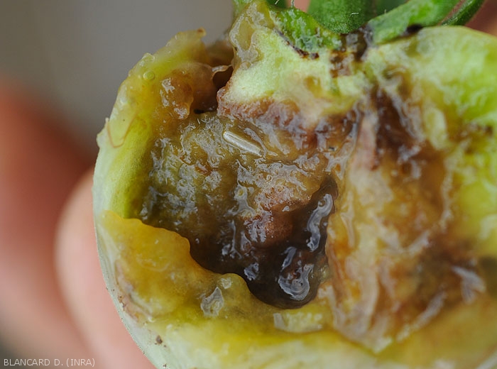 - Pourriture gagnant progressivement l'ensemble des fruits au fur et à mesure de l'activité des asticots (figures 4 et 5). Notons que cette pourriture est occasionnée par divers microorganismes pathogènes ou opportunistes qui envahissent et décomposent les tissus.