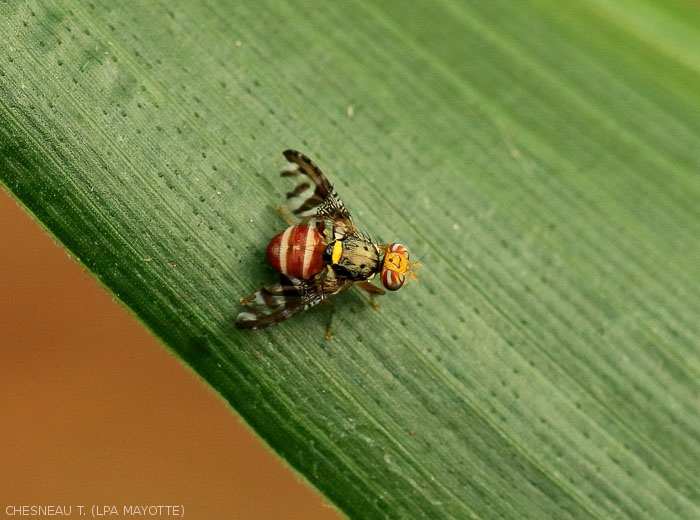 - Cycle biologique : composé de 5 stades (oeuf, 3 stades larvaires,pupe et adulte)s'étalant sur 26 à 35 jours en fonction des conditions climatiques. Ponte des femelles débutant 4 à 6joursaprèsl'accouplement à l'aidedeleuroviscapte pointu ;leursoeufsétantdéposéssousl'épiderme du fruit-hôte, à quelques millimètres de profondeur.