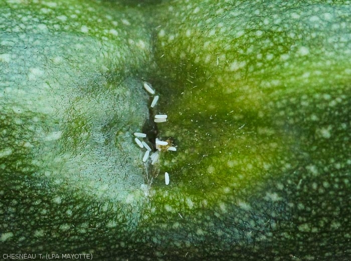 - Grâce à leur ovipositeur, elles pondent leurs oeufs dans l'épiderme des fruits ce qui provoque l'apparition de zones de piqûres vert sombre à noirâtres qui se ramollissent et se creusent (figures 1 à 3, et 5).