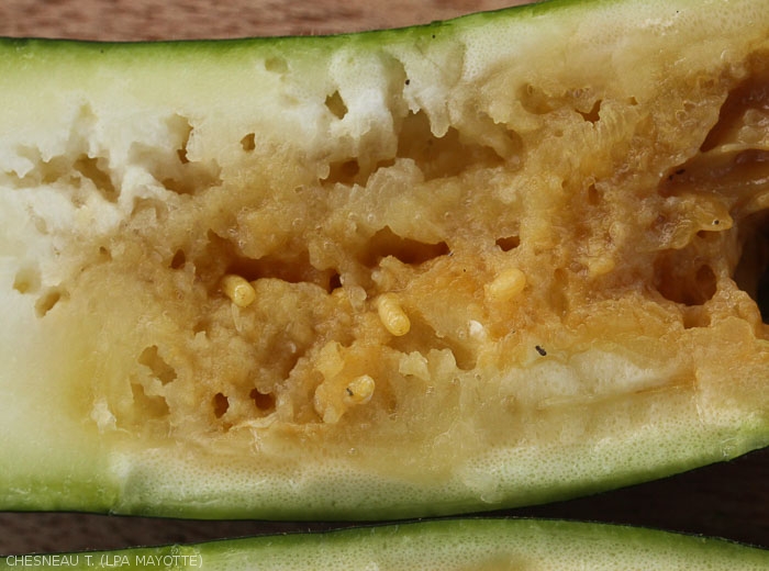 - Les larves nombreuses issues des oeufs se développent rapidement à l'intérieur du fruit en mangeant la pulpe (figure 4).