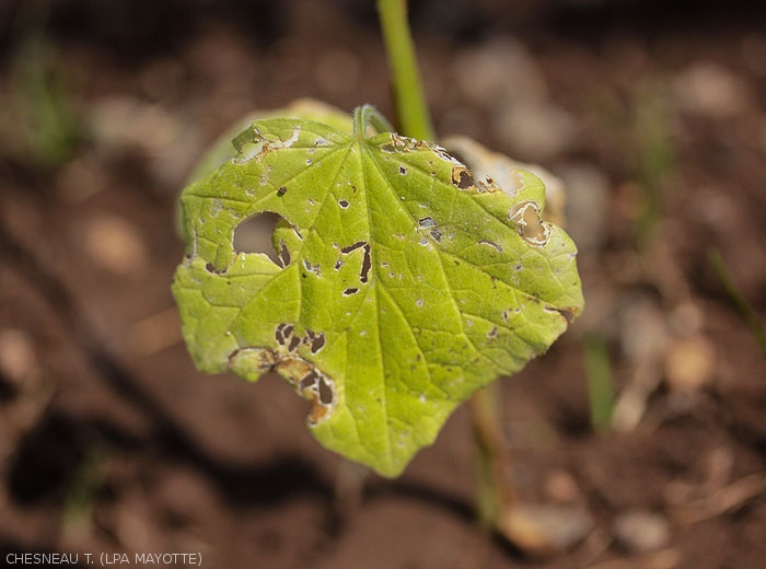 • Les dégâts peuvent être très importants sur les jeunes plants, les plantes plus âgées peuvent être totalement défoliées en cas de forte attaque.