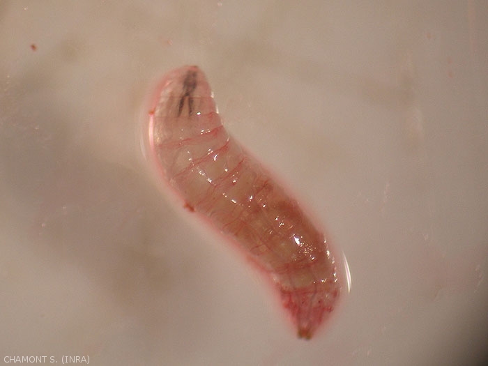 La larve apode de forme cylindrique (2 à 3 mm de long) et de couleur blanche présente des stigmates postérieurs surélevés à une de ses deux extrémités (figure 3). Cette larve passe par trois stades larvaires avant d'atteindre la pupaison. La pupe, de couleur brun-rouge, mesure 2-3mm de longueur. Chaque pupe présente une excroissance (stigmate) à chaque extrémité. Le stigmate antérieur de la pupe prend la forme de deux petites ailettes caractéristiqes (figure 4).