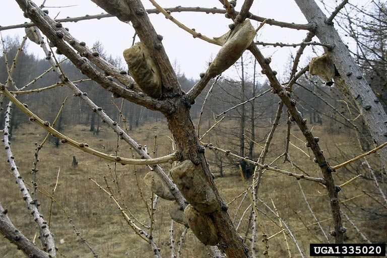 - Œufs en petits groupes sur les aiguilles, les branches voire le tronc,