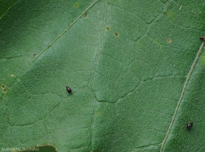 - Feuilles présentant de petites perforations du limbe régulières (quelques millimètres) et plutôt arrondies ; elles sont liées au parasitisme des insectes adultes qui broutent et dévorent régulièrement les faces supérieure et inférieure du limbe (figure ).
