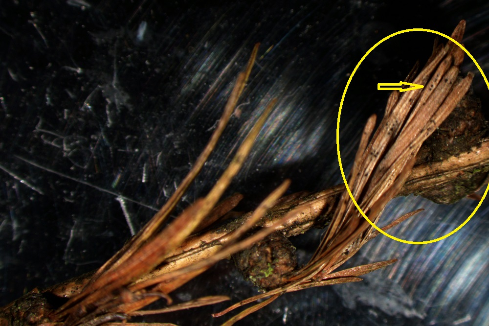 - Pas de fructifications visibles à l'oeil nu sur les aiguilles atteintes, ni de lignes ou de bandes transversales
