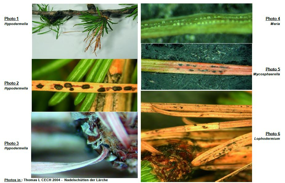 Meria laricis, Mycosphaerella laricina, Hypodermella laricis, Lophodermium laricinum