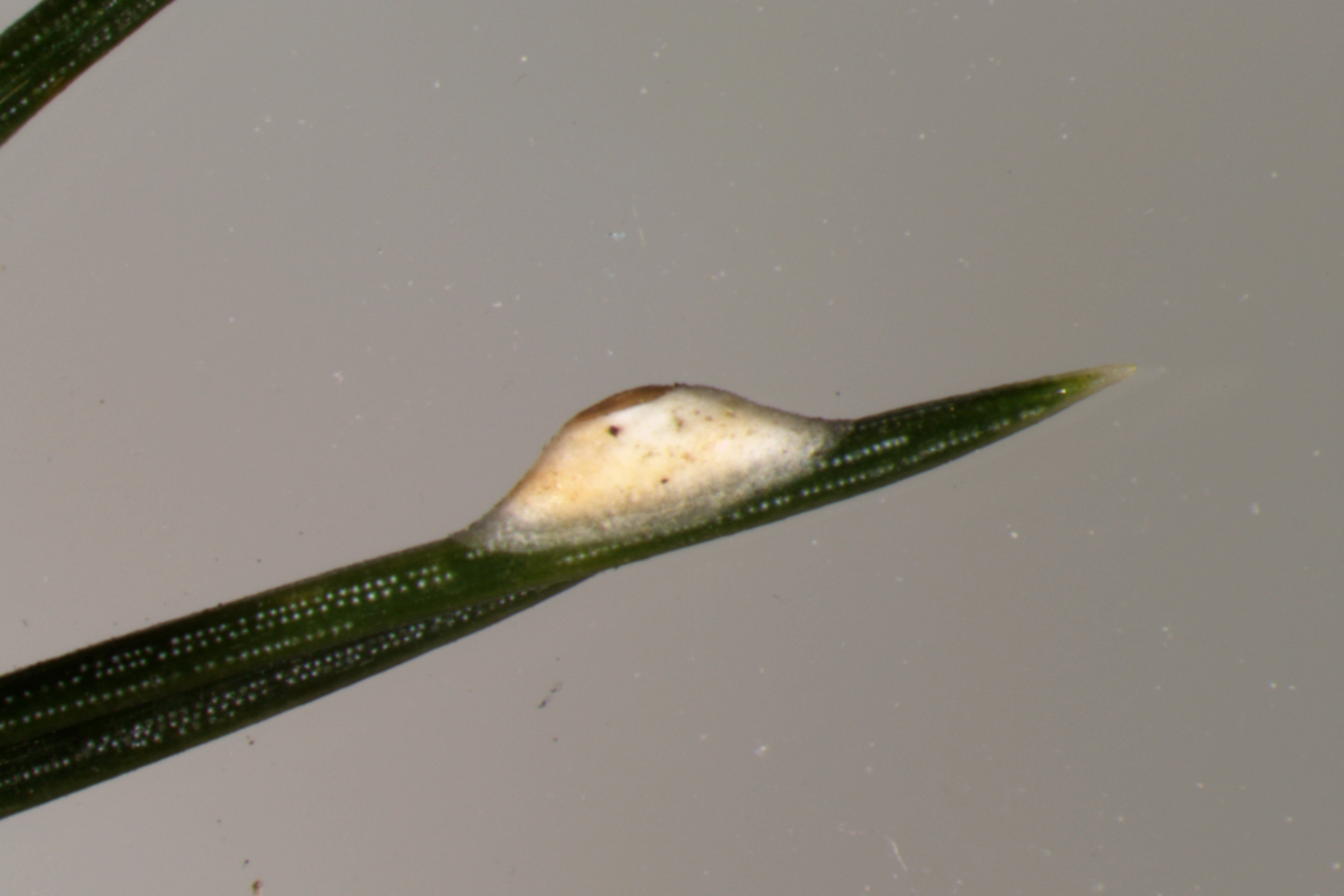 - La femelle âgée est le stade le plus fréquemment observable sur la plante. Elle présente un prosoma très fortement épaissi, de structure cornée et réticulée, brun noir foncé, de forme sub-parallélépipédique, dégageant seulement le pygidium très caractéristique de l'espèce et masquant tous les autres caractères