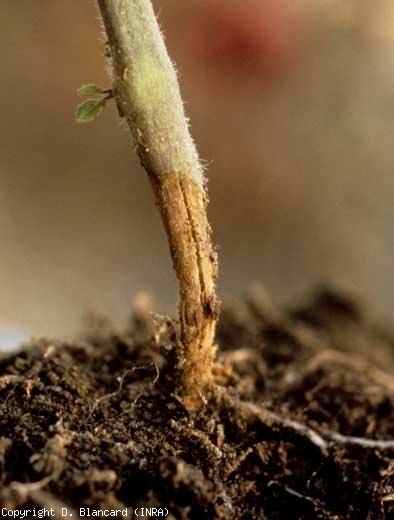 Botrytis cinerea peut sévir en pépinière, entraînant des manques à la levée ou des fontes de semis (figure 1). Les cotylédons sénescents lui permettent bien souvent de s'installer sur les jeunes tiges ; des chancres sur tige peuvent alors se développer (figure 2) et pénaliser le développement des jeunes plantes dans les semaines qui suivent la plantation.